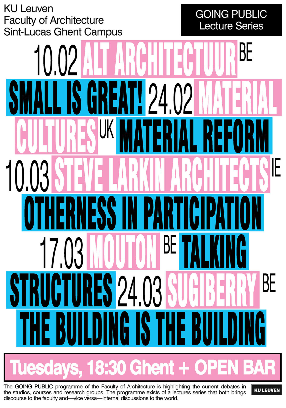 We would like to welcome you again this semester for the Going Public lecture series. Once more Prof. Riet Eeckhout put together a fascinating program: 10/02/’26 ALT architectuur (BE): “Small Is Great!” 24/02/’26 Material Cultures (UK): “Material Reform” 10/03/’26 Steve Larkin Architects (IE): “Otherness in Participation” 17/03/’26 Mouton (BE): “Talking Structures” 24/03/’26 SUGIBERRY (BE): “The […]